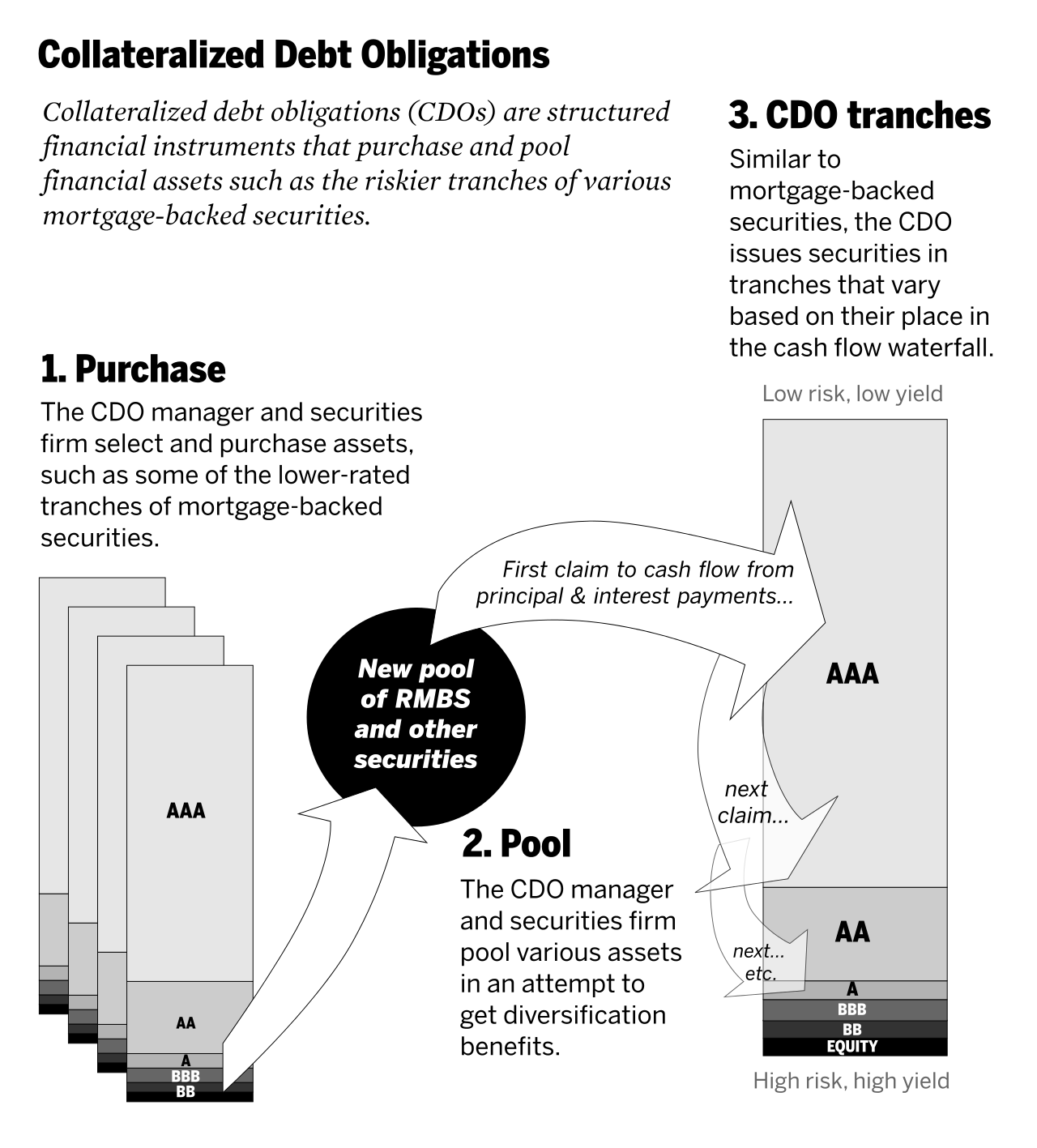 A Collateralized Debt Obligation (CDO) is similar to an MBS, but adds many more features. First and foremost, CDOs always contain a wide pool of mortgages, with each with an unrelated homeowner that is paying mortgage payments every month. An CDO is less risky than an individual mortgage, as its less likely that many homeowners will default instead of just one. The other important distinction is that CDOs offer tranching.