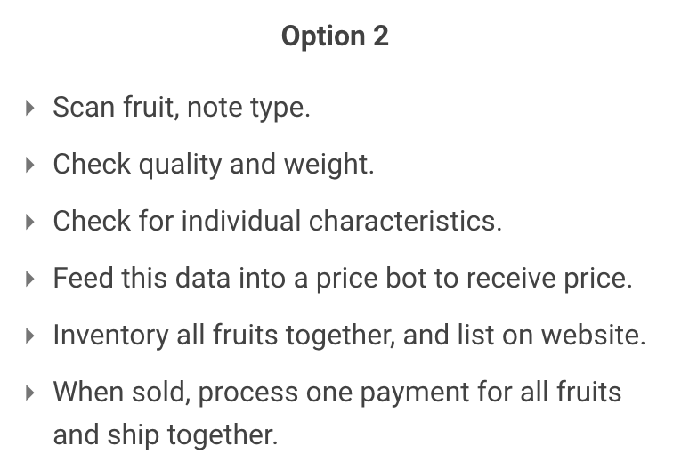 Let's go back to our example from our discussion on abstraction. We imagined an e-commerce website that has a price bot; the user gives the price bot fruit characteristics and the bot returns a price.