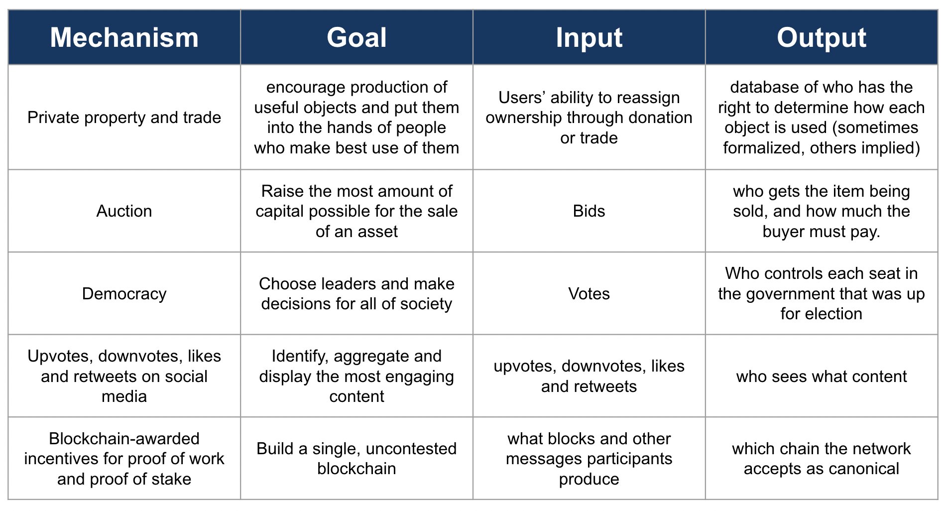 A mechanism is a tool that takes in inputs from multiple people, and uses these inputs to make some kind of decision that people care about in a way that is consistent with its participants’ values.
