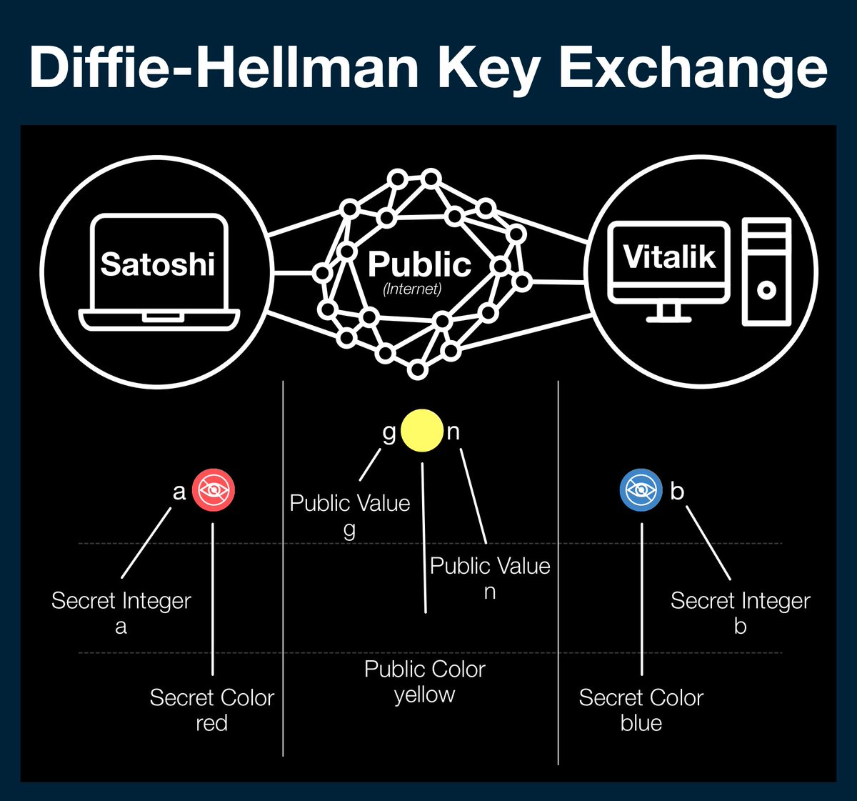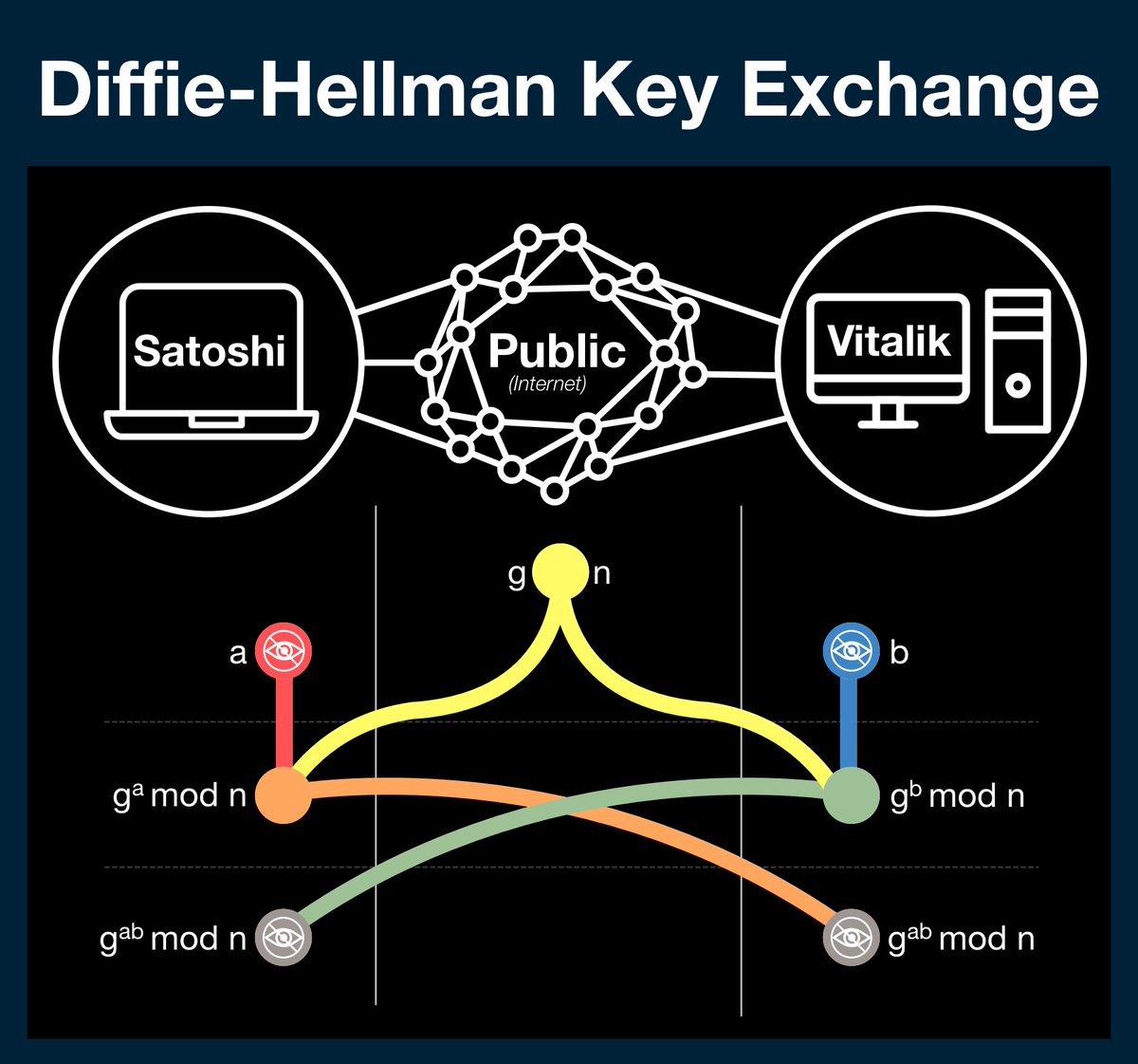 Diffie-Hellman begins with two parties (Satoshi, Vitalik), a public data channel and two publicly available numbers: g and n (yellow).
