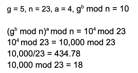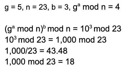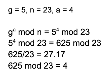 The formula below is a little scary; let me break it down. All we are doing is multiplying g by itself a/b times and then applying mod n.