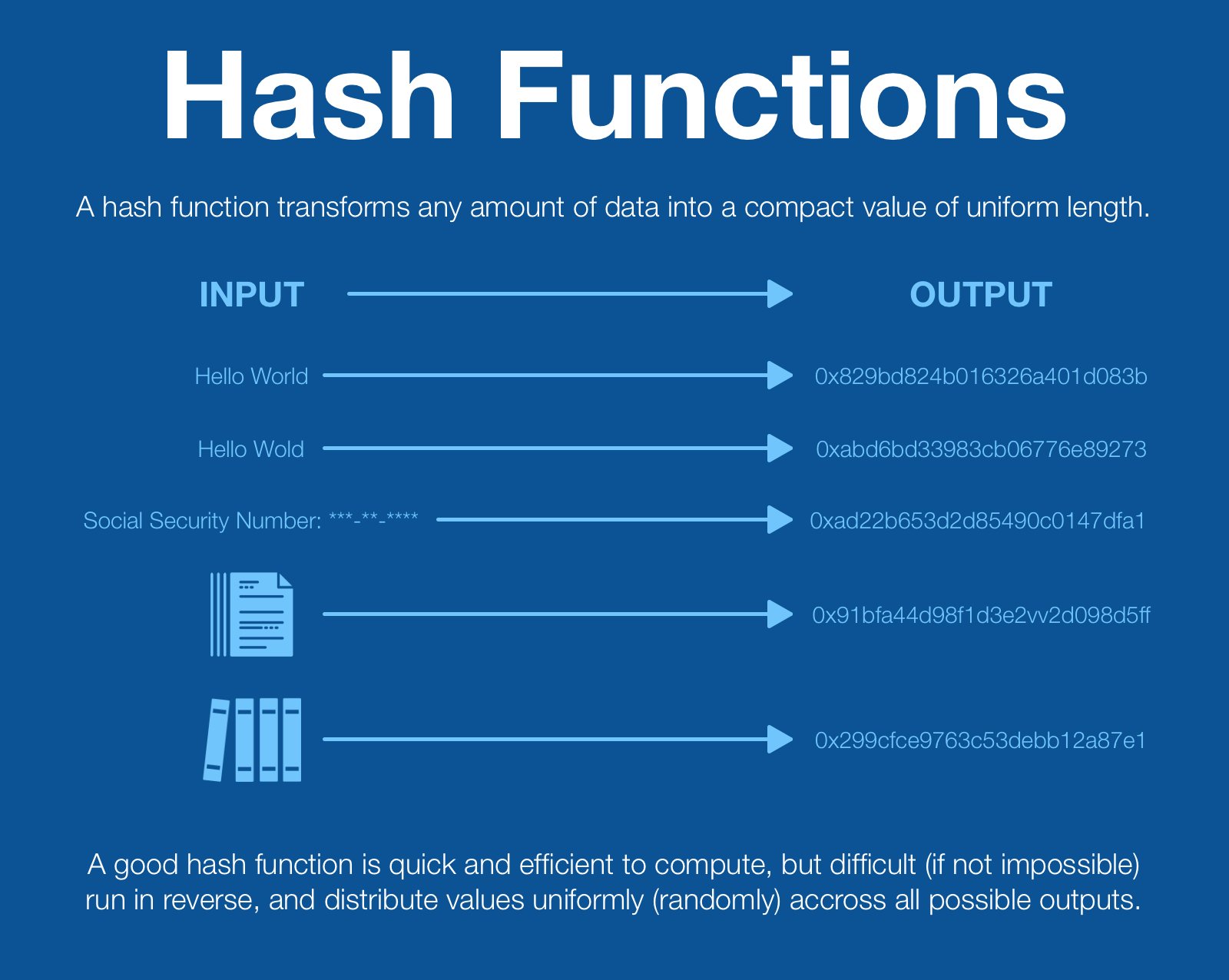 Hash functions have many different uses, but all uses rely on the same fundamental properties: