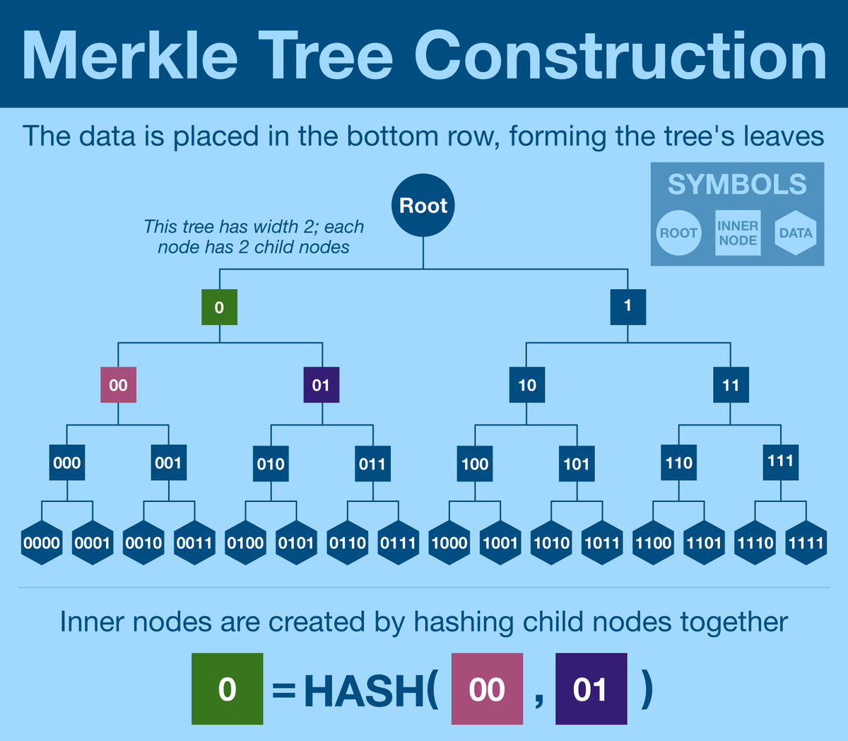Merkle Trees are made by successive rounds of hashing (applying a hash function to a set of data). A hash function transforms data of arbitrary contents (and length) into a unique, compact string.