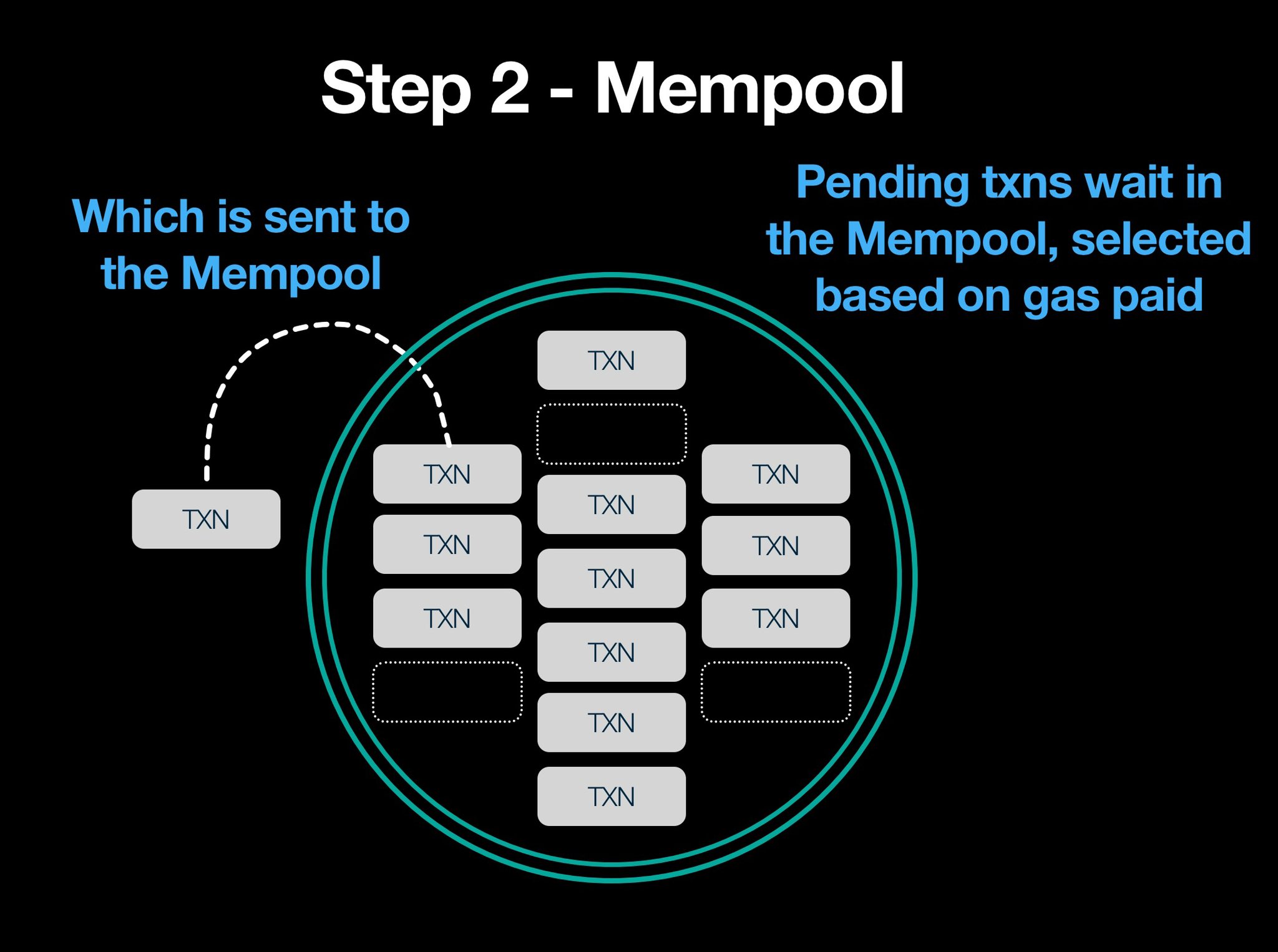 A transaction is bundled up into packets of data and sent to the Mempool. There it wait with all the pending transactions, waiting to selected to be included into the next block.
