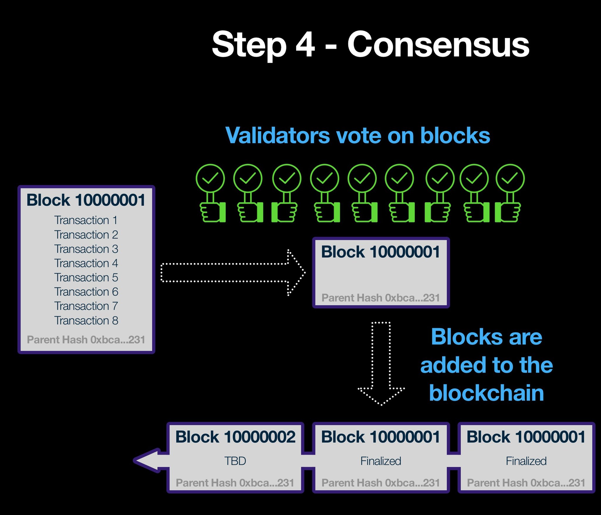 Blocks are sent to validators, who hold a current copy of the blockchain. They evaluate every new block; if it is a valid block (uses the correct start & end state and no invalid transactions).