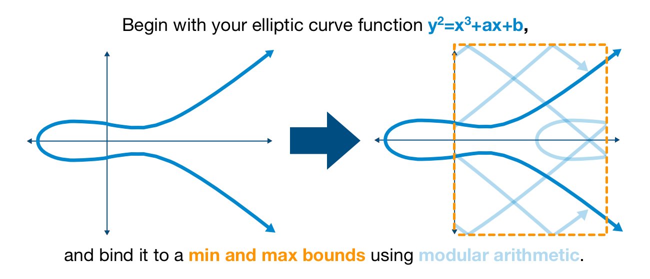 First, we must bind our curve to a minimum and maximum bounds using modular arithmetic. As previously discussed, this will (intentionally) introduce the elliptic curve discrete logarithm problem.