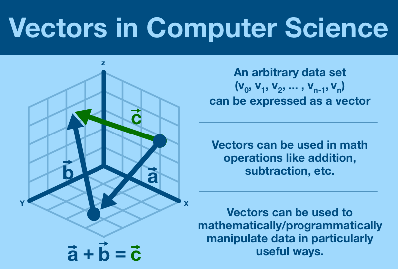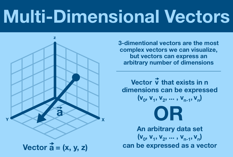 For now, all you need to remember is simple: vectors allow us to store an arbitrary amount of data in a way that can be mathematically manipulated.