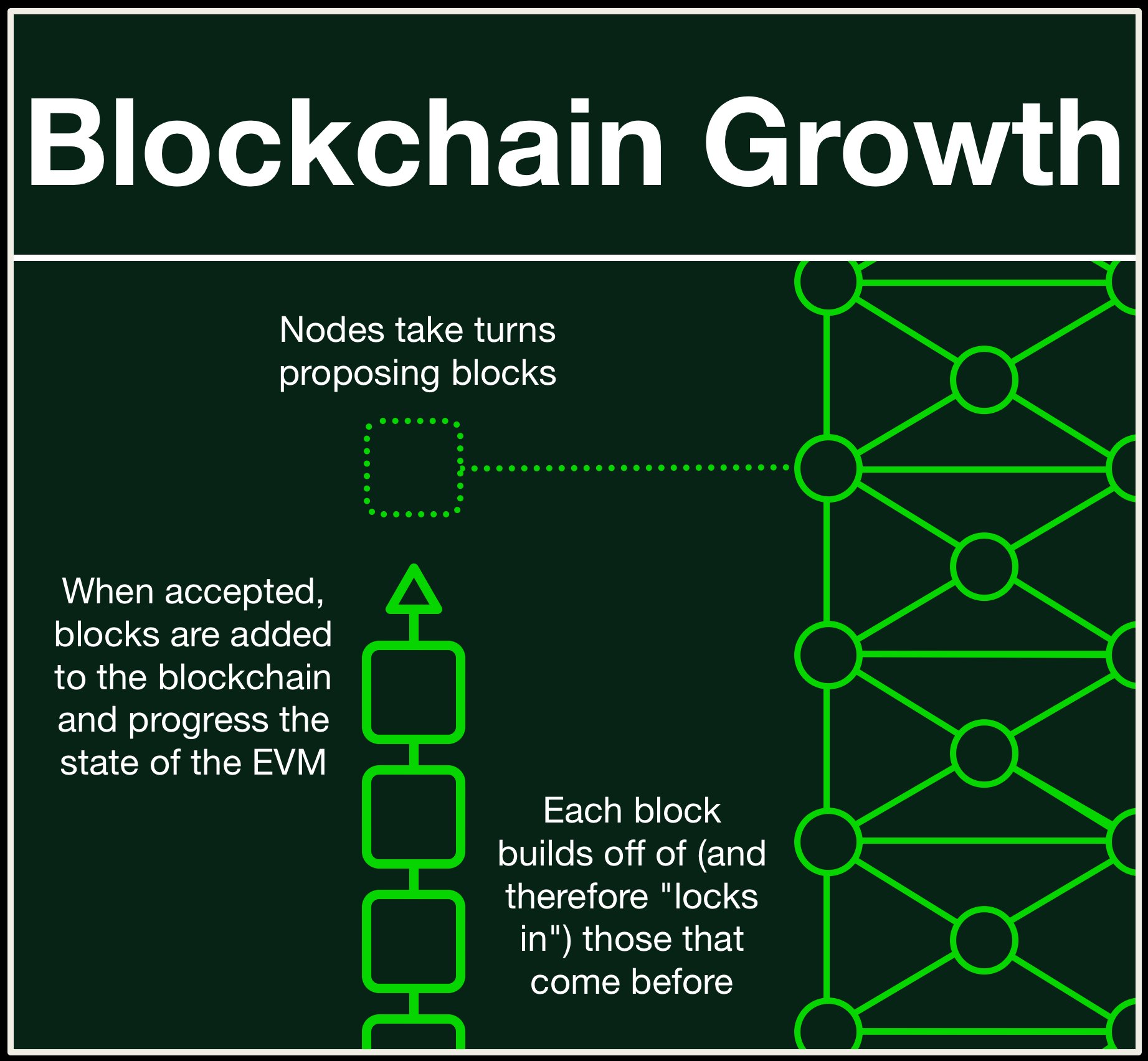 In normal circumstances, the blockchain grows 1 by 1; each leader orderly proposes a new block which is accepted by the network and added to the blockchain.