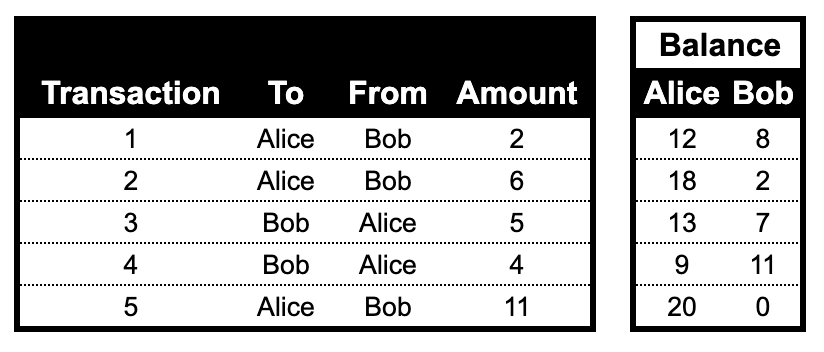 Transaction #5 is not possible unless transaction #4 happens first (Bob will not have the 11 he intends to send).