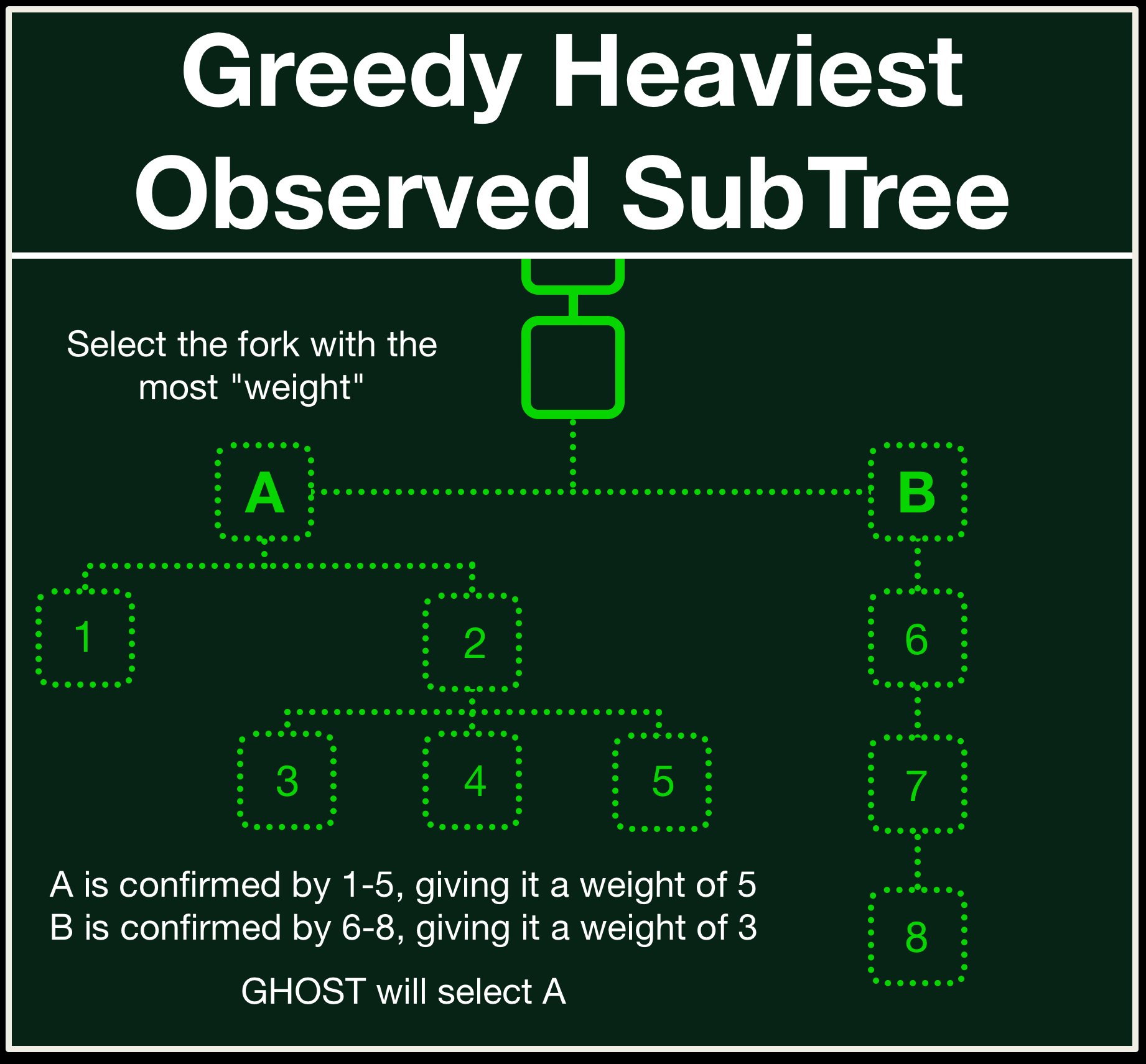Greedy Heaviest Observed SubTree (GHOST) is a fork-choice rule that selects the fork with the greatest accumulated weight (number of confirmations).