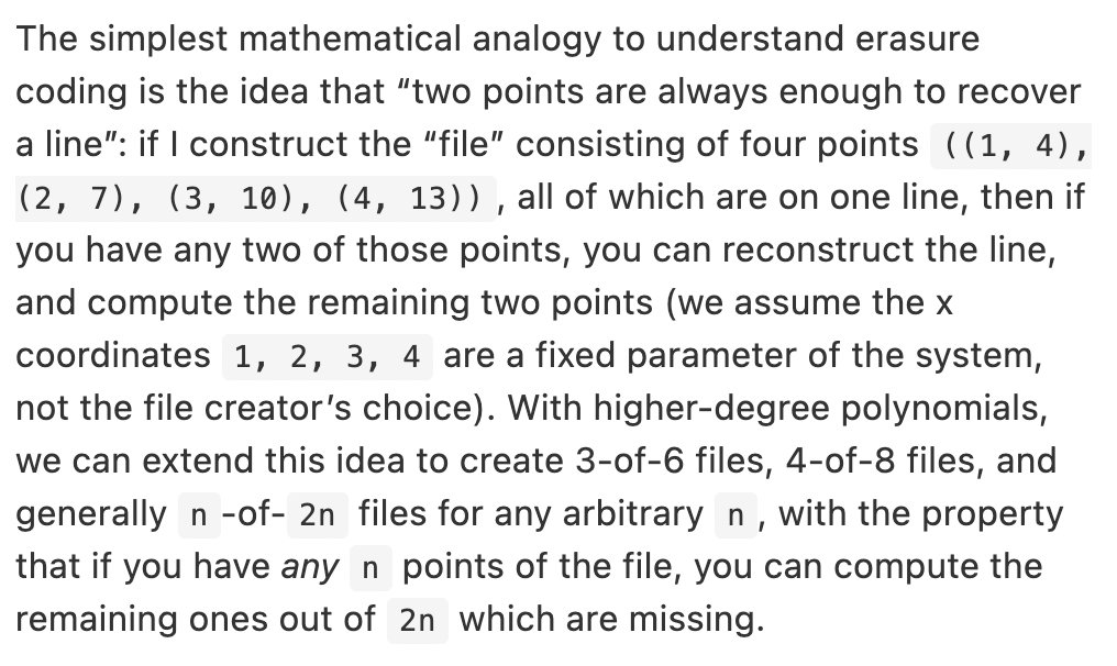 Vitalik authored one of the better metaphors I've read for erasure coding, I'll just leave it here.