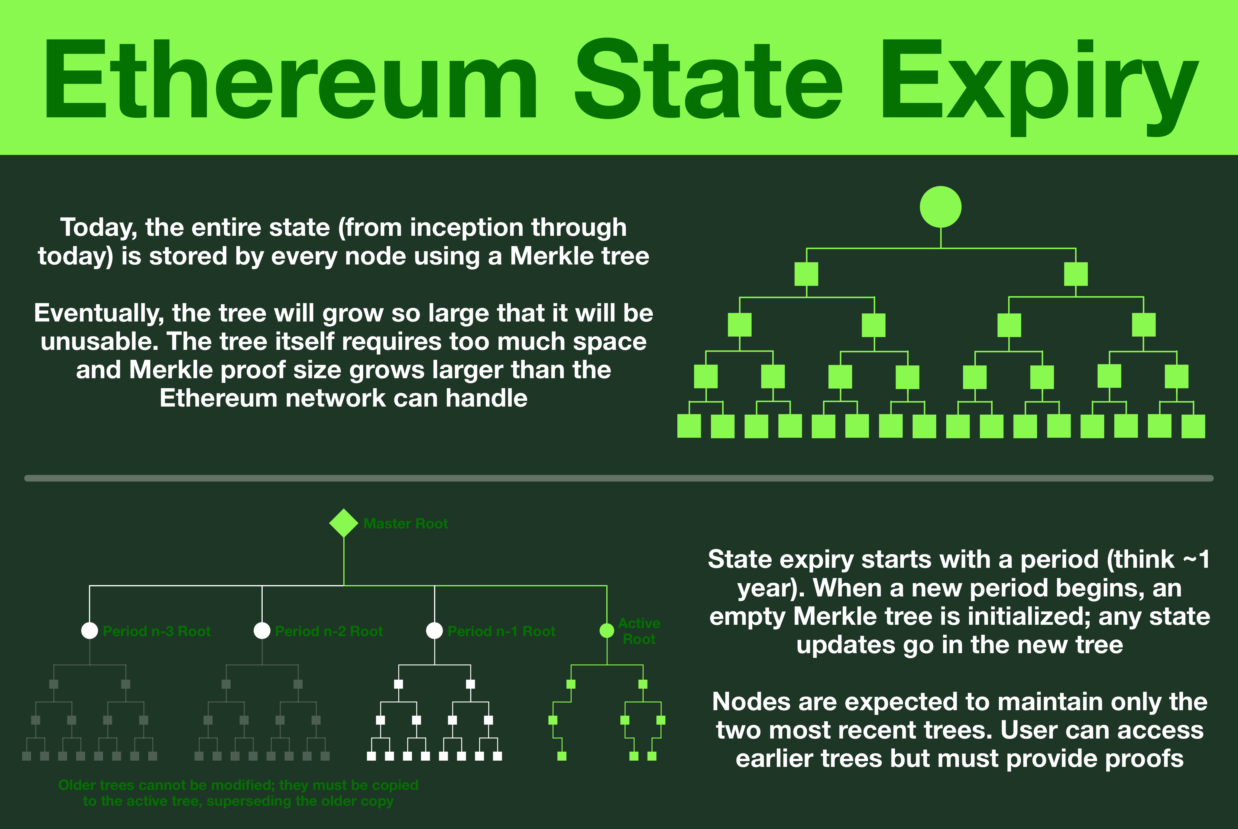 State expiry involves starting a new tree every period (~year), allowing Verkle trees to be phased in rather than swapped in.