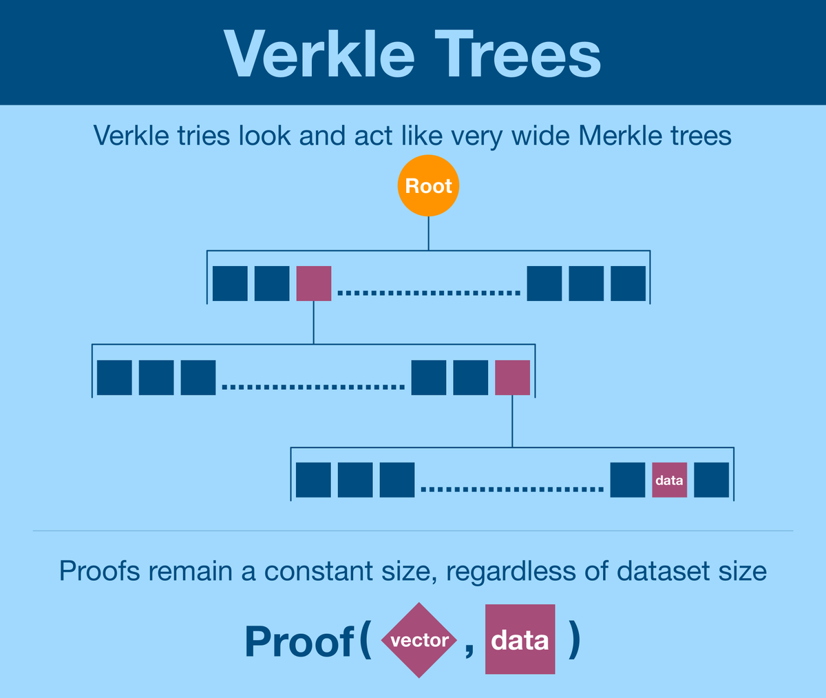 Looking at a picture, a Verkle tree is much wider and shorter than a Merkle tree. Using advanced cryptography, it exploits this structure to create proofs of constant size.