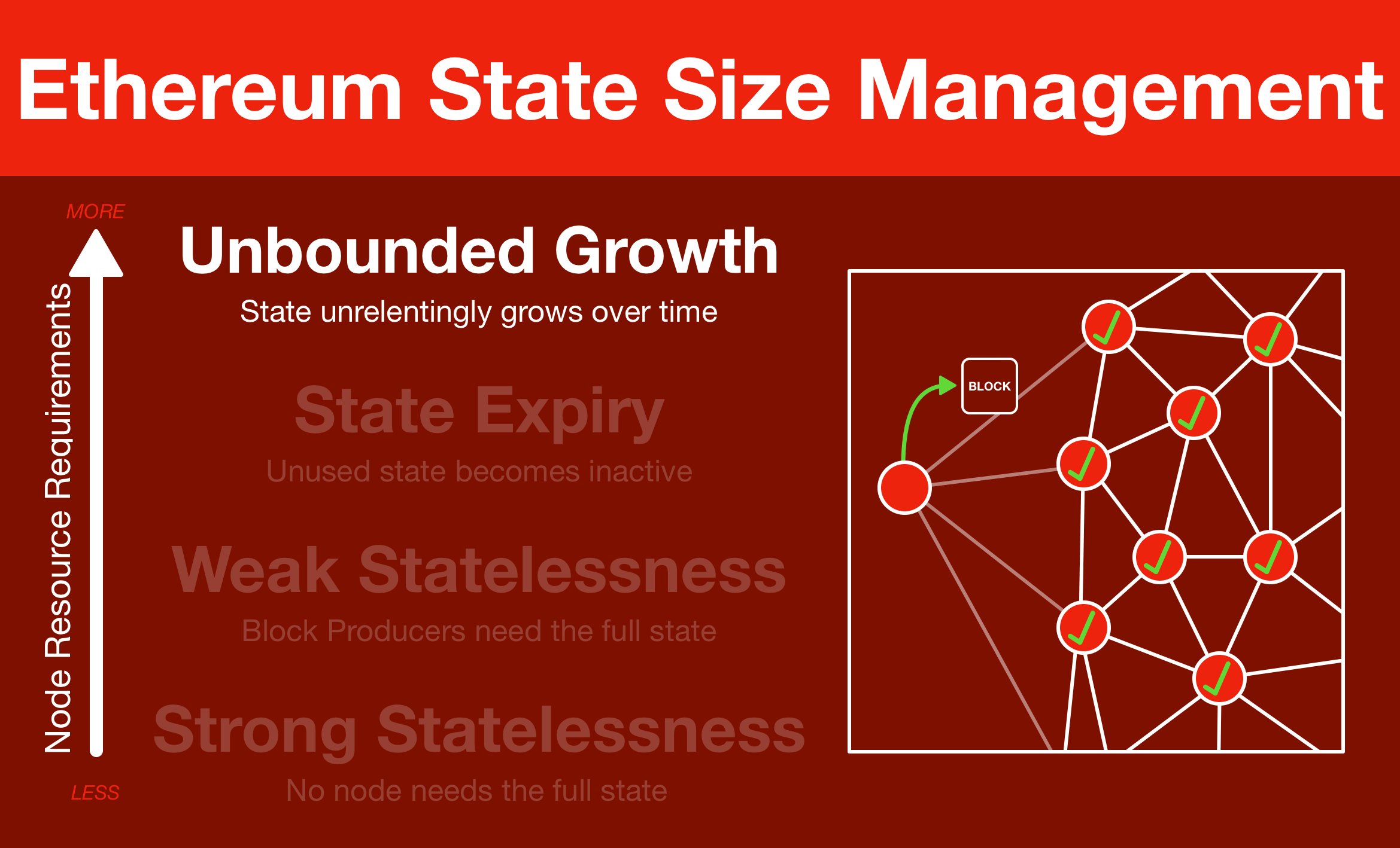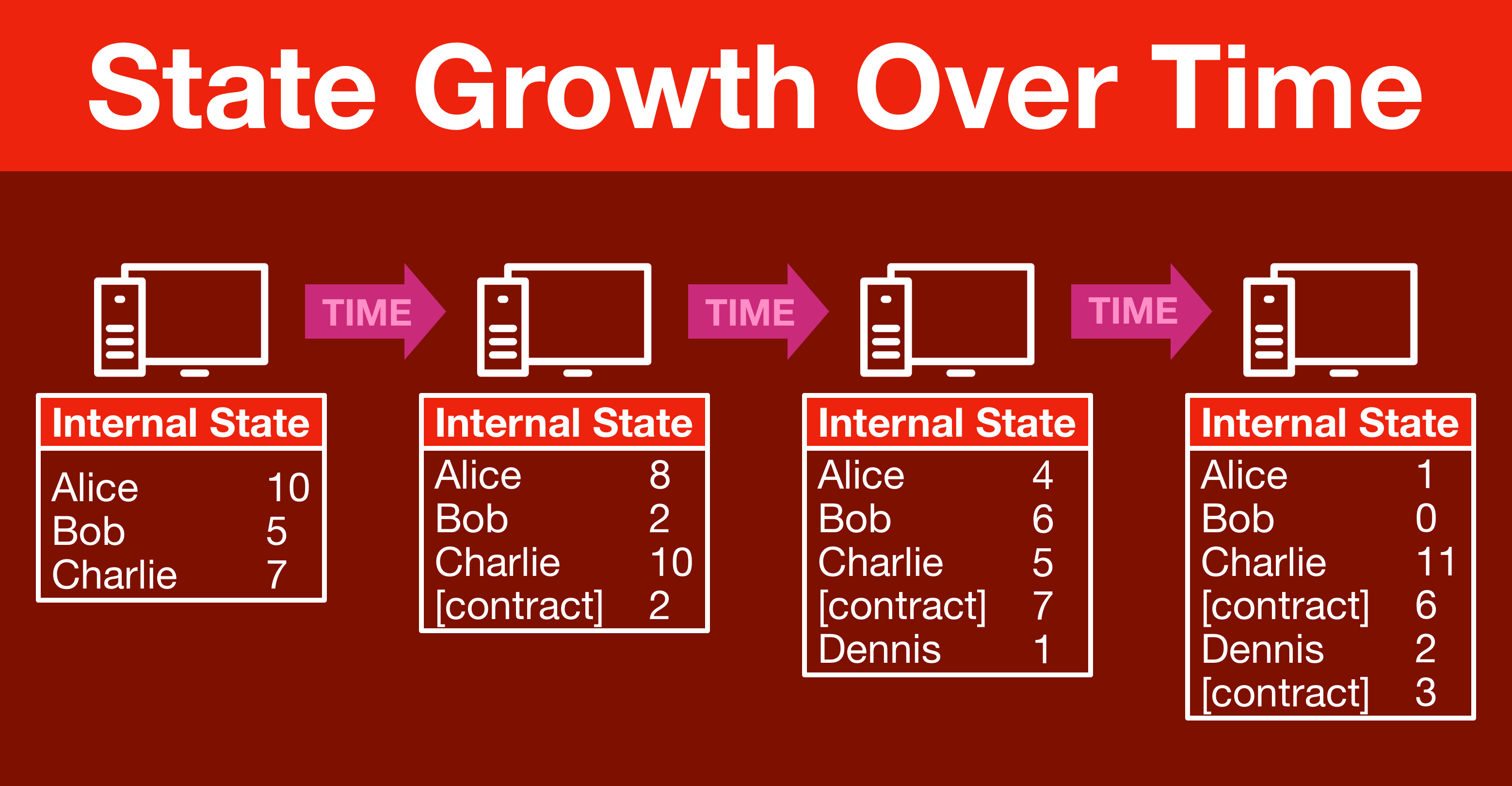 Over time, the state grows and grows, placing heavier and heavier burdens on the real computers (nodes) running the EVM.