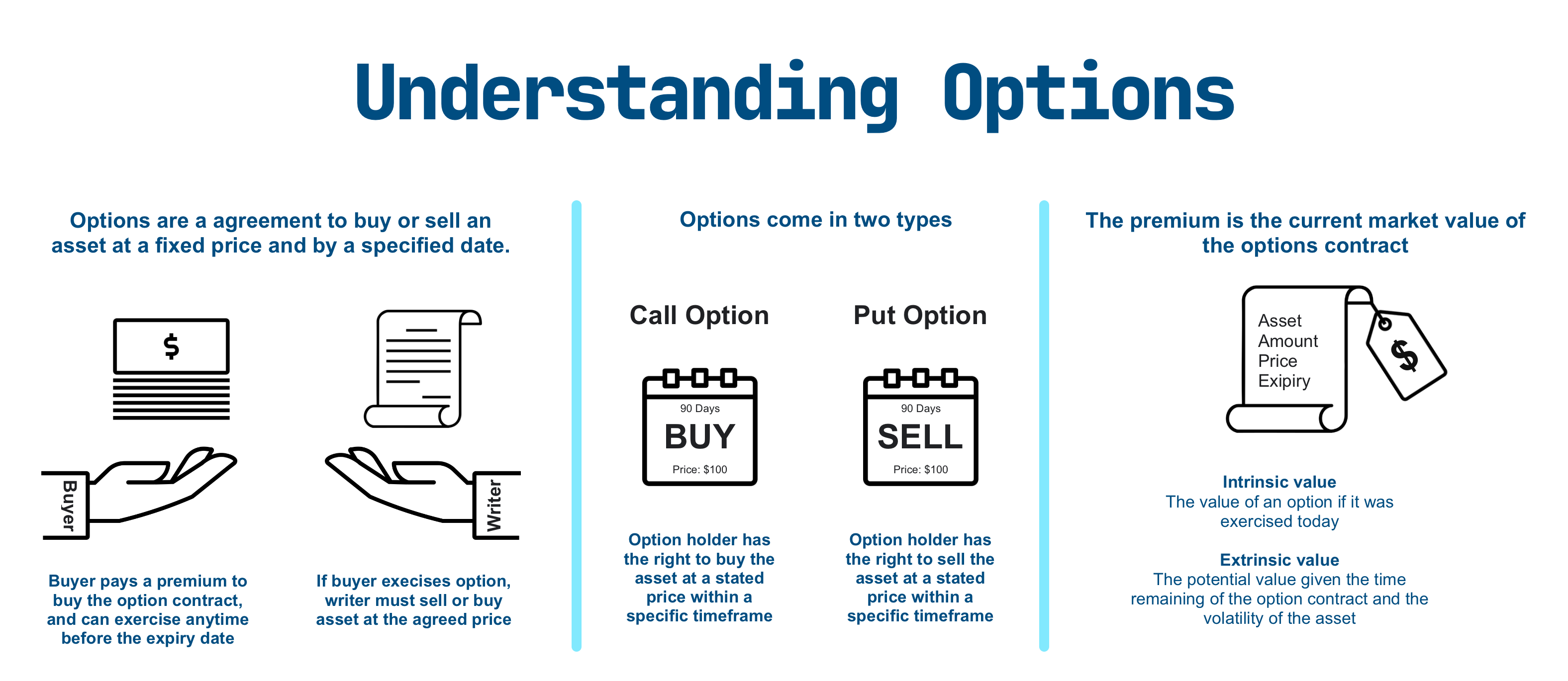 Options are a contract between two parties to buy/sell an asset (in the future) using a fixed price and date.