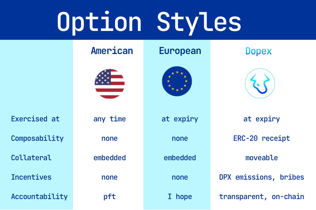 At first glance, a Dopex option seems very similar to a European option; both can only be exercised at expiry.